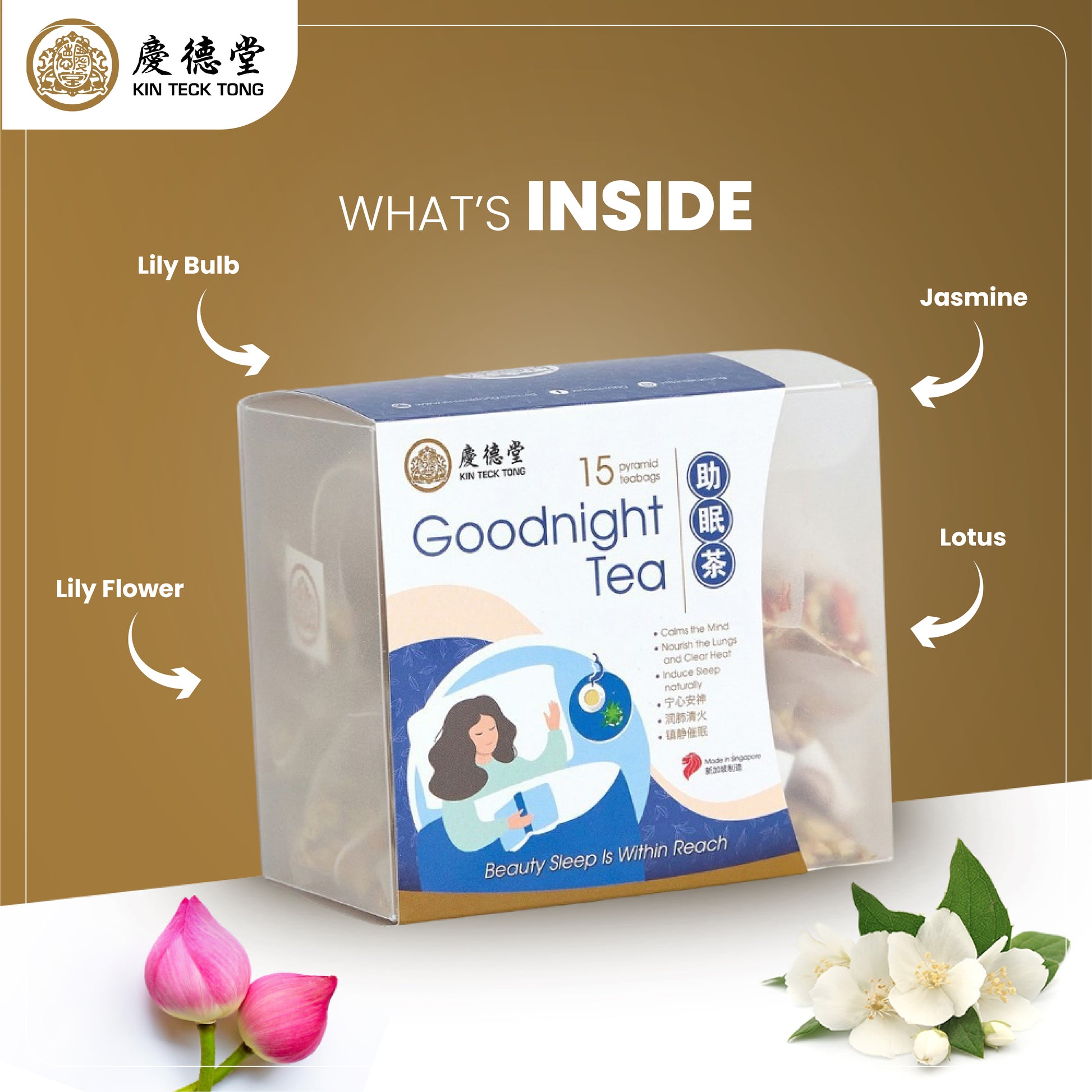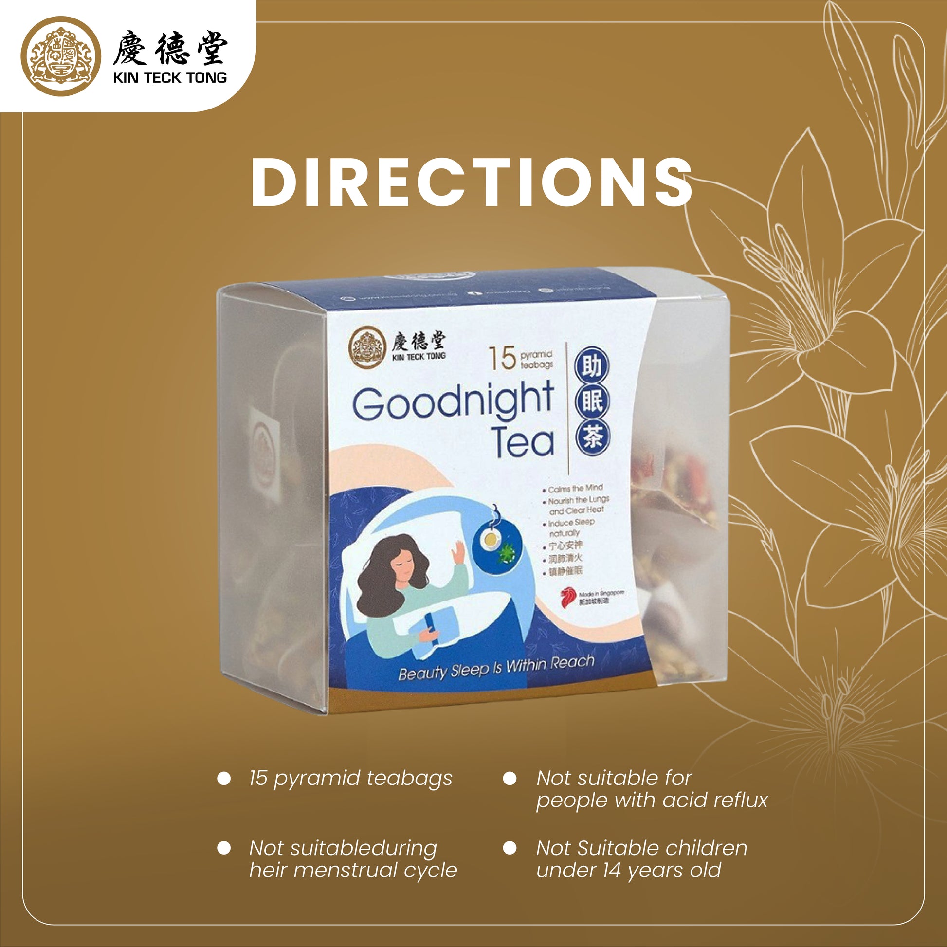 Relax your body and mind with our Goodnight Tea which contains a blend of natural herbs with relaxing and calming properties.